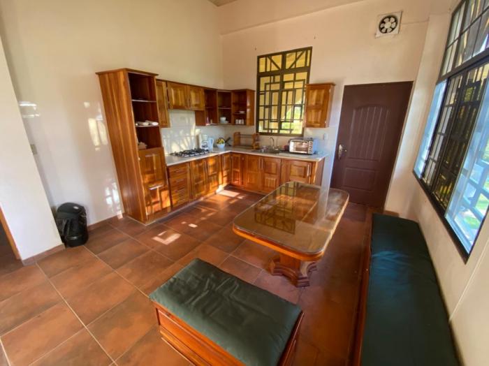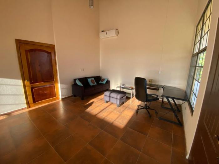 los espacios interiores son amplios y bien distribuidos, incluyendo una cocina grande y abierta, una segunda cocina más pequeña, sala, comedor, oficina, despensa, área de lavandería y cuarto de servicio. la propiedad también incluye un garaje cerrado para dos autos con puertas automáticas.