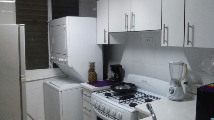 apartamento amoblado, decoración moderna y línea blanca.