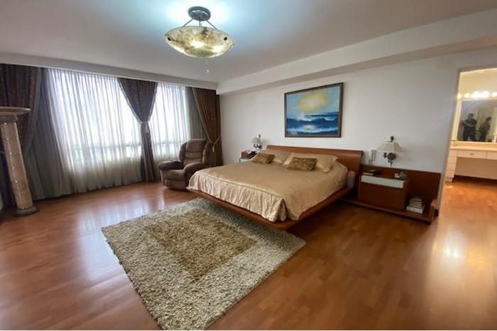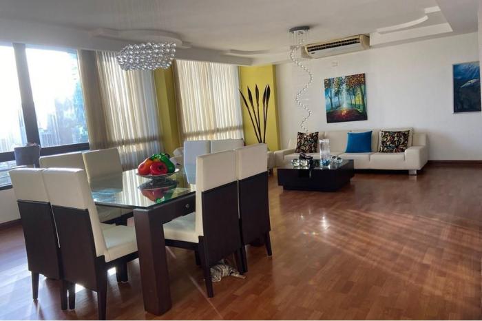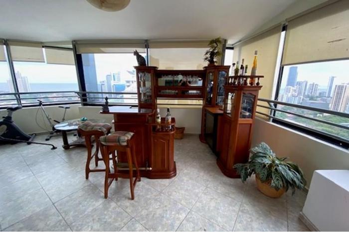 Alquiler de apartamento penthouse en obarrio, panamáTengo para ti este apartamento tipo penthouse con una superficie de 420 m2 con una excelente vista a la ciudad, muy bien distribuido ubicado en obarrio con fácil acceso desde la calle 50 y calle 60 este, transporte público, estaciones del metro y muy cerca al corredor sur, hospitales, restaurantes, colegios y centros comerciales como el multiplaza pacific.este apartamento se alquila con linea blanca y aires acondicionados, está distribuido de la siguiente manera:planta baja:sala, comedor, den, medio baño de visita, 2 recámaras cada una con su baño propio, cocina con área de desayunador, lavandería, cuarto y baño de servicio.planta alta:dos recámaras cada una con su baño, la recámara principal con walking closet, lavamanos doble, jacuzzi, ducha, una pequeña sala de estar, estudio, balcón abierto, terraza cerrada con amplios ventanales, bar.cuenta con 3 estacionamientos.área social completa que incluye piscina, sauna, baño turco, salón de fiestas
