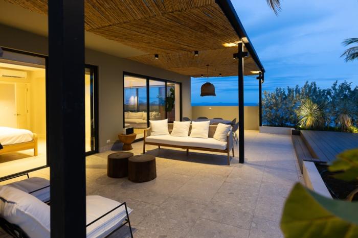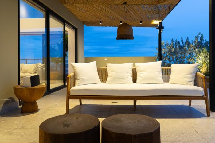 -terraza privada y piscina, oasis personal para relajarse con panoramas infinitos del mar