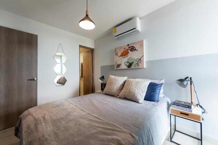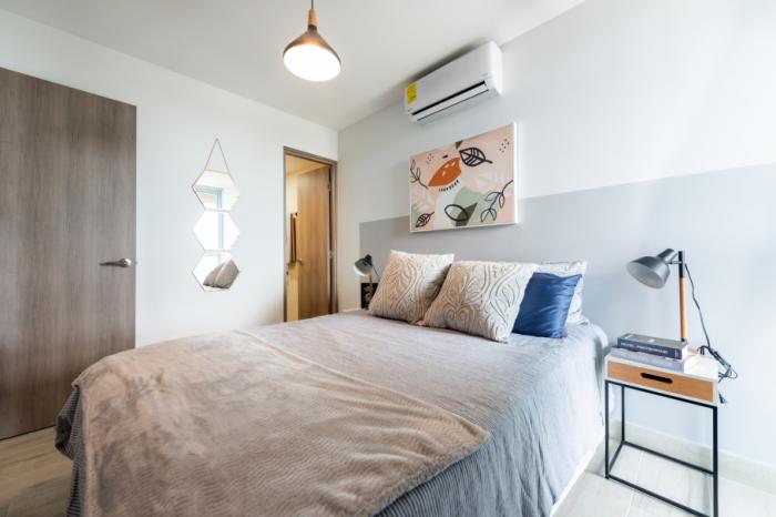 el complejo está conformado por dos torres: la torre 100 lista para ocupar, y la torre 200 en preventa. los apartamentos cuentan con opciones de 1, 2 y 3 recámaras, con distribuciones funcionales que incluyen cocina abierta, lavandería, sobres de granito en cocina y baños, pisos de cerámica importada, puertas de seguridad y opción de balcón. los metrajes van desde los 47 m² hasta los 86 m².