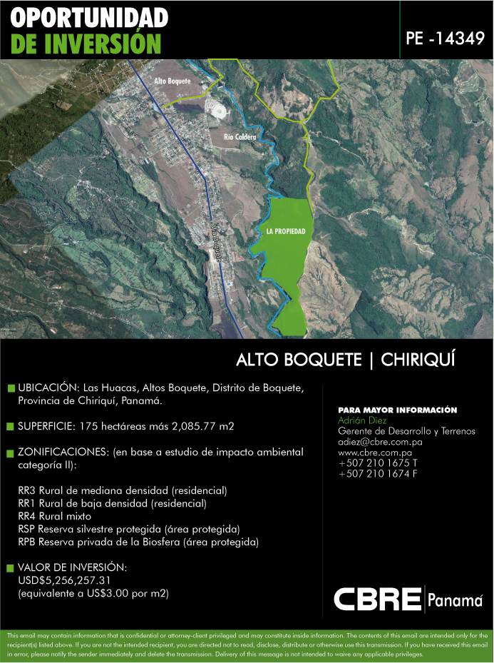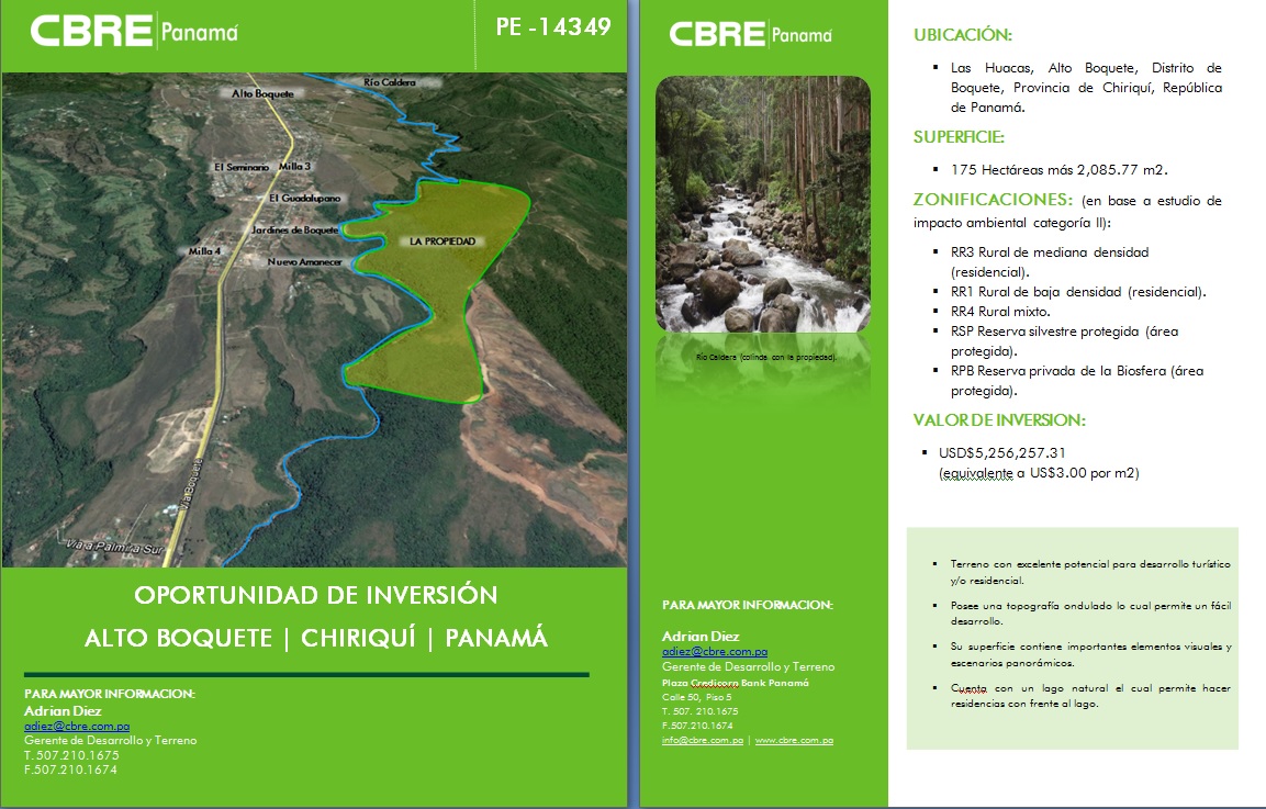 Terreno ideal para desarrollo en boquete, oportunidad de inversiónGlobo de terreno con superficie total de 175 hectáreas más 2,085.77 m2, el cual brinda una excelente oportunidad de inversión tipo turístico y/o residencial, con ubicación en el sector de las hu