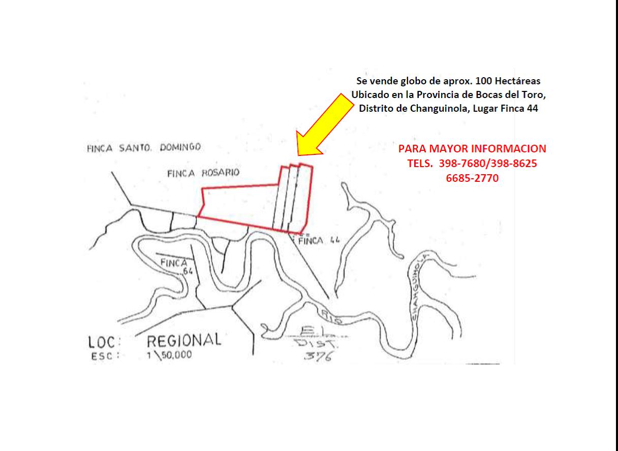 Vendo 100 hectáreas, changuinola, sector finca 44, bocas del toroSe venden 100 hectáreas, aprox. ubicadas en el distrito de chanquinola, lugar finca 44, cerca del humedal san san pond sak