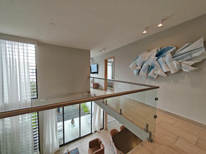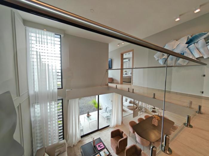 esta casa modelo alere townhome c1 atípica, tiene un lote de 317.92 m² y cuenta con 186.73 m² de construcción, distribuidos en 3 recámaras, 2.5 baños, walk-in closet en la recámara principal, sala de doble altura (5.00 m), comedor, cocina, terraza techada, cuarto y baño de servicio, lavandería cerrada y estacionamiento techado para dos autos. incorpora acabados de alta calidad, como porcelanato español, cielos rasos de gypsum con altura libre de 2.60 m, baños revestidos de piso a techo, muebles en mdf hidrófugo, sobres de cuarzo, grifería grohe, ventanas de aluminio con termopanel, sistema de gas y previsión para paneles solares